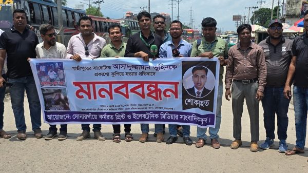 সাংবাদিক তুহিন হত্যায় জড়িতদের ফাঁসির দাবীতে মানববন্ধন ও বিক্ষোভ মিছিল অনুষ্ঠিত