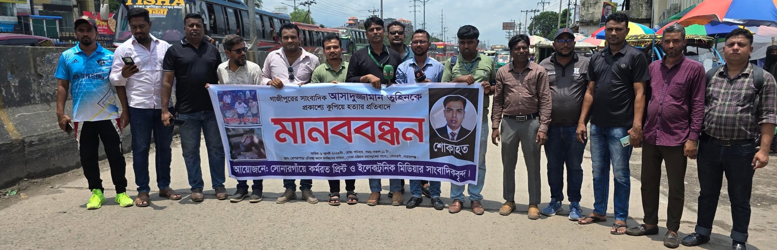 গাজীপুরে প্রকাশ্যে সাংবাদিক আসাদুজ্জামান তুহিনকে কুপিয়ে হত্যার প্রতিবাদে ঢাকা-চট্টগ্রাম মহাসড়কের পাশে নারায়ণগঞ্জের সোনারগাঁও মোগরাপাড়া চৌরাস্তা জামে মসজিদের সামনে হত্যায় জড়িতদের ফাঁসির দাবীতে মানববন্ধন ও বিক্ষোভ মিছিল অনুষ্ঠিত হয়েছে।